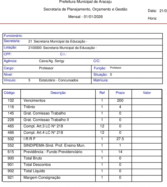 Em relação ao Código 521 – Previdência mês anterior, foi constatado que alguns/as docentes não tiveram o desconto previdenciário efetuado no contracheque da segunda parcela do décimo terceiro, passando a sofrer o desconto agora em janeiro. Por outro lado, há casos de desconto em duplicidade, em que o valor foi descontado tanto em dezembro quanto novamente em janeiro. Nessas situações, o sindicato orienta a realização de solicitação administrativa de “Revisão de Remuneração” no Aracaju Inteligente, com pedido de restituição dos valores cobrados indevidamente, mediante a anexação dos contracheques e dos extratos bancários.