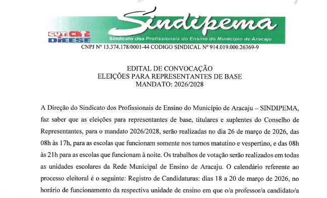 A Direção do Sindicato dos Profissionais de Ensino do Município de Aracaju – SINDIPEMA, faz saber que as eleições para representantes de base, titulares e suplentes do Conselho de Representantes, para o mandato 2026/2028, serão realizadas no dia 26 de março de 2026, das 08h às 17h, para as escolas que funcionam somente nos turnos matutino e vespertino, e das 08h às 21h para as escolas que funcionam à noite. Os trabalhos de votação serão realizados em todas as unidades escolares da Rede Municipal de Ensino de Aracaju. O calendário referente ao processo eleitoral é o seguinte: Registro de Candidaturas: dias 18 a 20 de março de 2026, no horário de funcionamento da respectiva unidade de ensino em que o/a professor/a candidato/a esteja vinculado, mediante o preenchimento e assinatura do formulário/requerimento distribuído pelo SINDIPEMA; data das eleições: 26 de março do corrente ano; horário da votação: das 08h às 17h (escolas que funcionam nos turnos da manhã e da tarde) – das 08h às 21h (Escolas que funcionam à noite); data da posse dos Representantes Eleitos: dia 07 de abril de 2026.